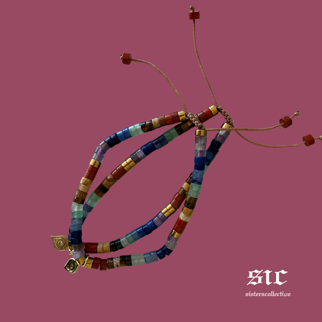 Elemental Rainbow Air Charm Bracelet. A super cute and easy to wear gemstone charm bracelet for those of airy inclinations. A talisman to empower and charm especially for the Air signs: Gemini, Libra and Aquarius.  Specially designed with flow from handcrafted 4mm rainbow coloured dyed serpentine rondelles on a fine-thread shambala cord (adjustable fit).  Gemstones are aligned to the flow of balance, play, easy- attraction, wealth and good fortune with Gold Hematite for magnetism.  Aligns with planetary rulers Mercury (Whiro), Venus (Kōpū) and Uranus (Ruamoko).  A pretty little charm bracelet to attract more good fortune and showcase your natural peace ease and flow.  Cute statement piece for you or to gift for those with air element birthdays.  Affirmation: Summer Breeze Makes Me Feel Fine