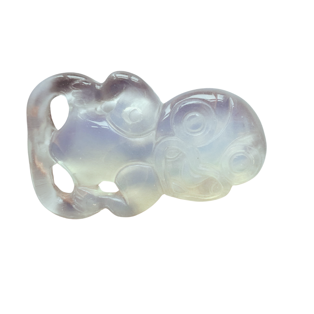 Opalite Hei Tiki Pendant for Inner Stillness. The Moonstone Opalite Hei Tiki Charm (approx. 5cm x 3cm) comes on a sterling silver hanger. Original design and our best-seller. Comes in two shades either milky opaque creamy white or transculent bluish-white tones. This soft-glowing taonga that makes a special present for light seekers, dreamers, and intuitive wahine. Carved from high-grade, lab-created Opalite and set on a sterling silver hanger, it radiates the ethereal hues of He Marama - guiding emotional balance, spiritual clarity, and calm wairua. In te ao Maori, the Hei Tiki is a sacred symbol of life force, ancestry, and protection. Together, they create a charm of moonlit stillness and gentle strength, perfect to wear on your own chain, cord, or strand. Pendant only - necklace not included. Please handle with care - both Opalite and silver are sensitive to moisture, chemicals, and energy overload. Avoid water and perfumes, cleanse in moonlight or beside cool water, and store wrapped in cloth. This Hei Tiki is not just jewellery - it's a moonbeam for your soul.